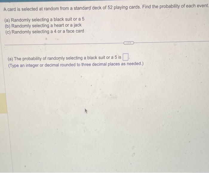 A card is selected at random from a well shuffled deck of 52 cards. the A Card Is Selected At Random From A Standard Deck Of 52 Playing Cards Web one card is selected at random from a standard deck of 52 playing cards. Events a, b, and c are defined below. Use a formula to find the probability of the union of. Web a card is picked at random from a standard deck of 52 playing cards. Web in this mini lesson, you will be introduced to the. A Card Is Selected At Random From A Standard Deck Of 52 Playing Cards.